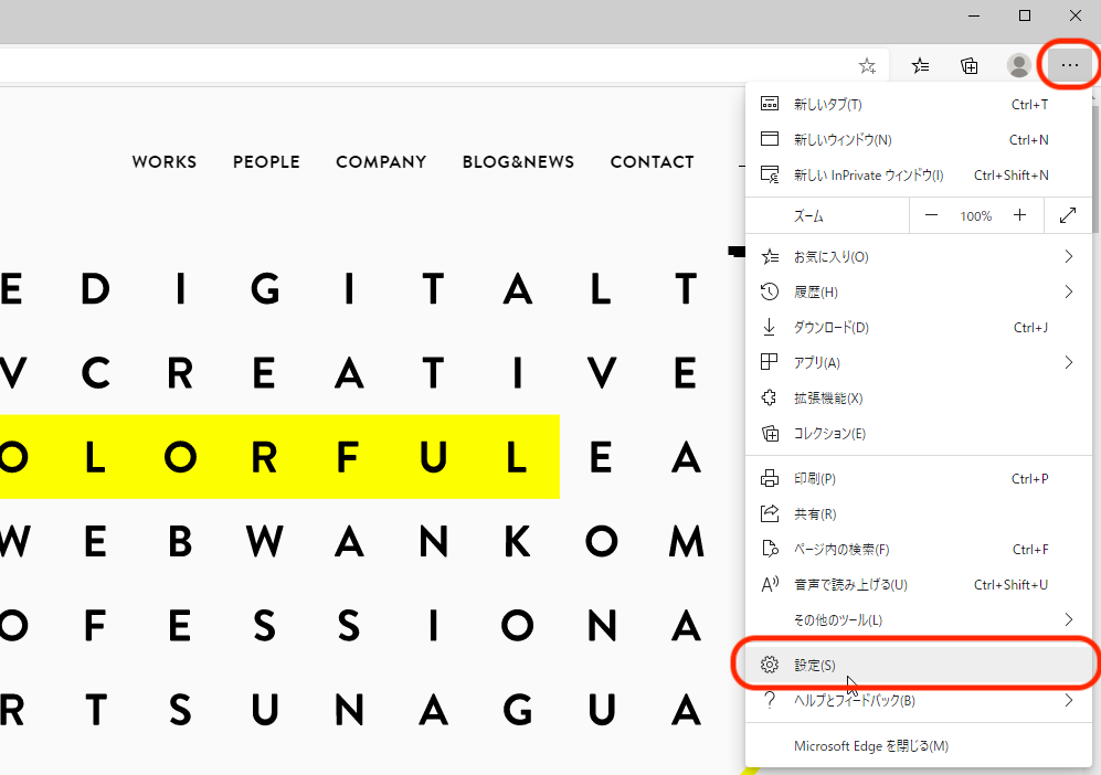 ① Microsoft Edgeの画面右上にある【…】マークをクリックします。表示されたメニューの中から【設定】を選択します。
